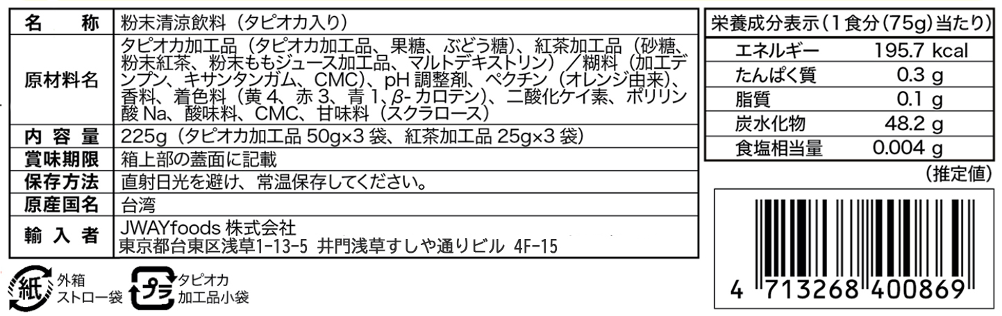 Mango Peach Black Teaマンゴーピーチーティー風味 華やかな香りの紅茶に、マンゴーとピーチの甘酸っぱい調和が楽しめる一杯 内容量 フルーツタピオカ3袋、紙ストロー3本 、 マンゴーピーチー風味ティーパウダー3袋 重量 225g(タピオカ50g×3袋、ティーパウダー25g×3袋) 保存方法 常温保存16ヶ月 保存期限 16ヶ月 産原国 台湾 成分表示 << 前のページに戻る