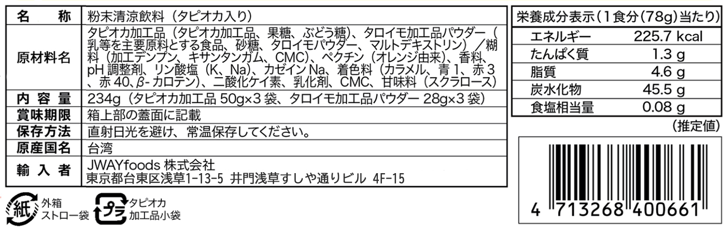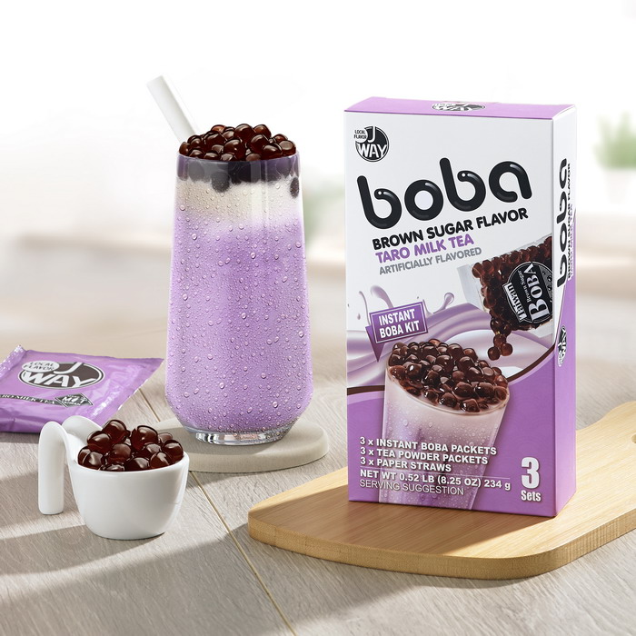 Taro Milkタロイモミルク ほのかな甘さと風味豊かなタロイモが織り成す贅沢な味わい 内容量 黒糖タピオカ3袋、紙ストロー3本 、 タロイモミルクパウダー3袋 重量 234g(タピオカ50g×3袋、ミルクティーパウダー28g×3袋) 保存方法 常温保存16ヶ月 保存期限 16ヶ月 産原国 台湾 成分表示 << 前のページに戻る