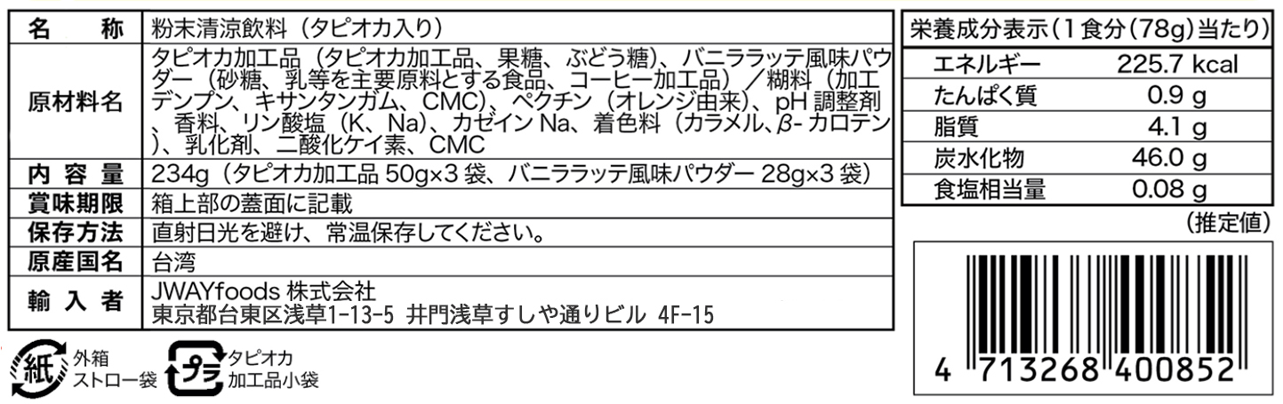 Vanilla Latteバニララッテ風味 濃厚なバニラとなめらかなミルクの絶妙な組み合わせ 内容量 黒糖タピオカ3袋、紙ストロー3本 、 バニララッテ風味パウダー3袋 重量 234g(タピオカ50g×3袋、ラッテーパウダー28g×3袋) 保存方法 常温保存16ヶ月 保存期限 16ヶ月 産原国 台湾 成分表示 << 前のページに戻る