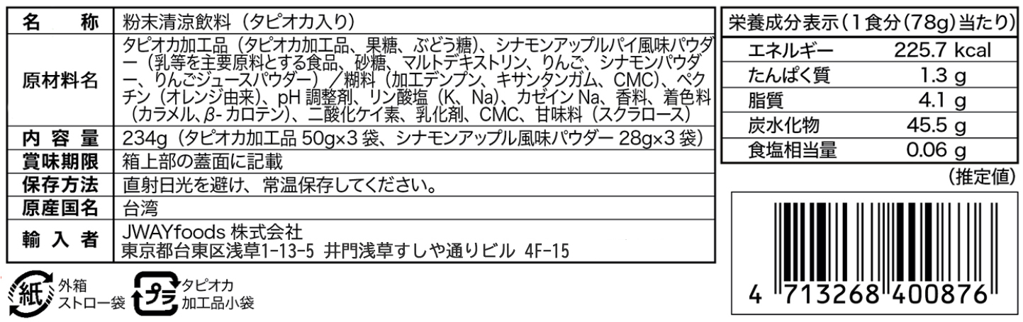 Cinnamon Appleシナモンアップル 温かみのあるシナモンと甘酸っぱいアップルの香りが、心を温める一杯(アップル果実入り) 内容量 黒糖タピオカ3袋、紙ストロー3本 、 シナモンアップルティーパウダー3袋 重量 234g(タピオカ50g×3袋、ティーパウダー28g×3袋) 保存方法 常温保存16ヶ月 保存期限 16ヶ月 産原国 台湾 成分表示 << 前のページに戻る
