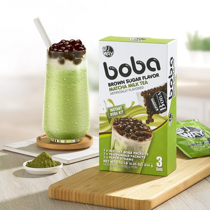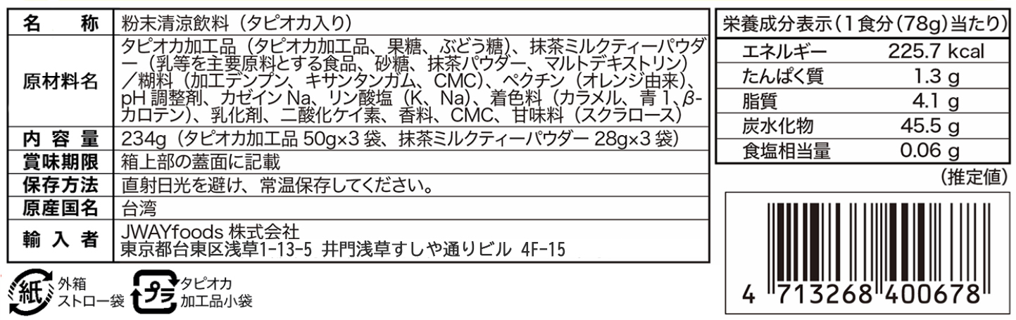 Matcha Milk Tea抹茶ミルクティー 濃厚な抹茶となめらかなミルクのハーモニー 内容量 黒糖タピオカ3袋、紙ストロー3本 、 抹茶ミルクティーパウダー3袋 重量 234g(タピオカ50g×3袋、ミルクティーパウダー28g×3袋) 保存方法 常温保存16ヶ月 保存期限 16ヶ月 産原国 台湾 成分表示 << 前のページに戻る